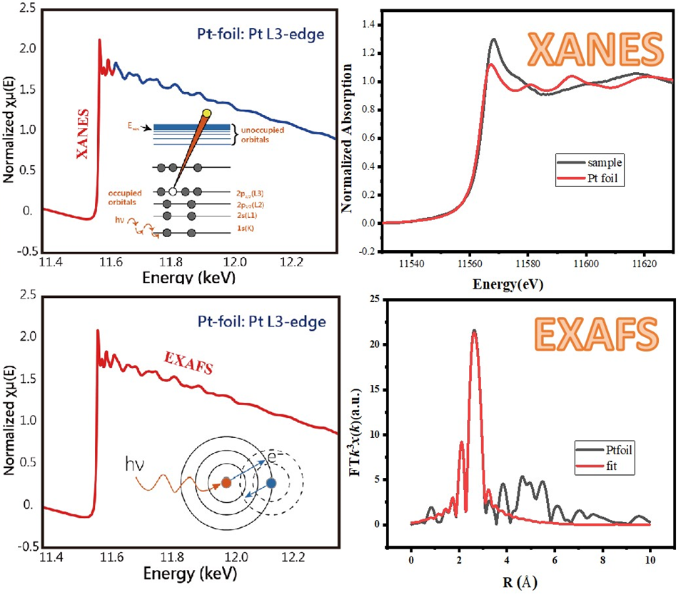 同步輻射光源與傳統(tǒng)X光射源的最大差異為可提供能量連續(xù)且高強度的光源,同時具有極佳的偏振性。利用此特點的代表技術(shù)即為X射線吸收能譜(X-ray absorption spectroscopy: XAS),分為兩個觀測范圍:X射線近吸收邊精細結(jié)構(gòu)(XANES)及延伸X射線吸收精細結(jié)構(gòu)(EXAFS)。